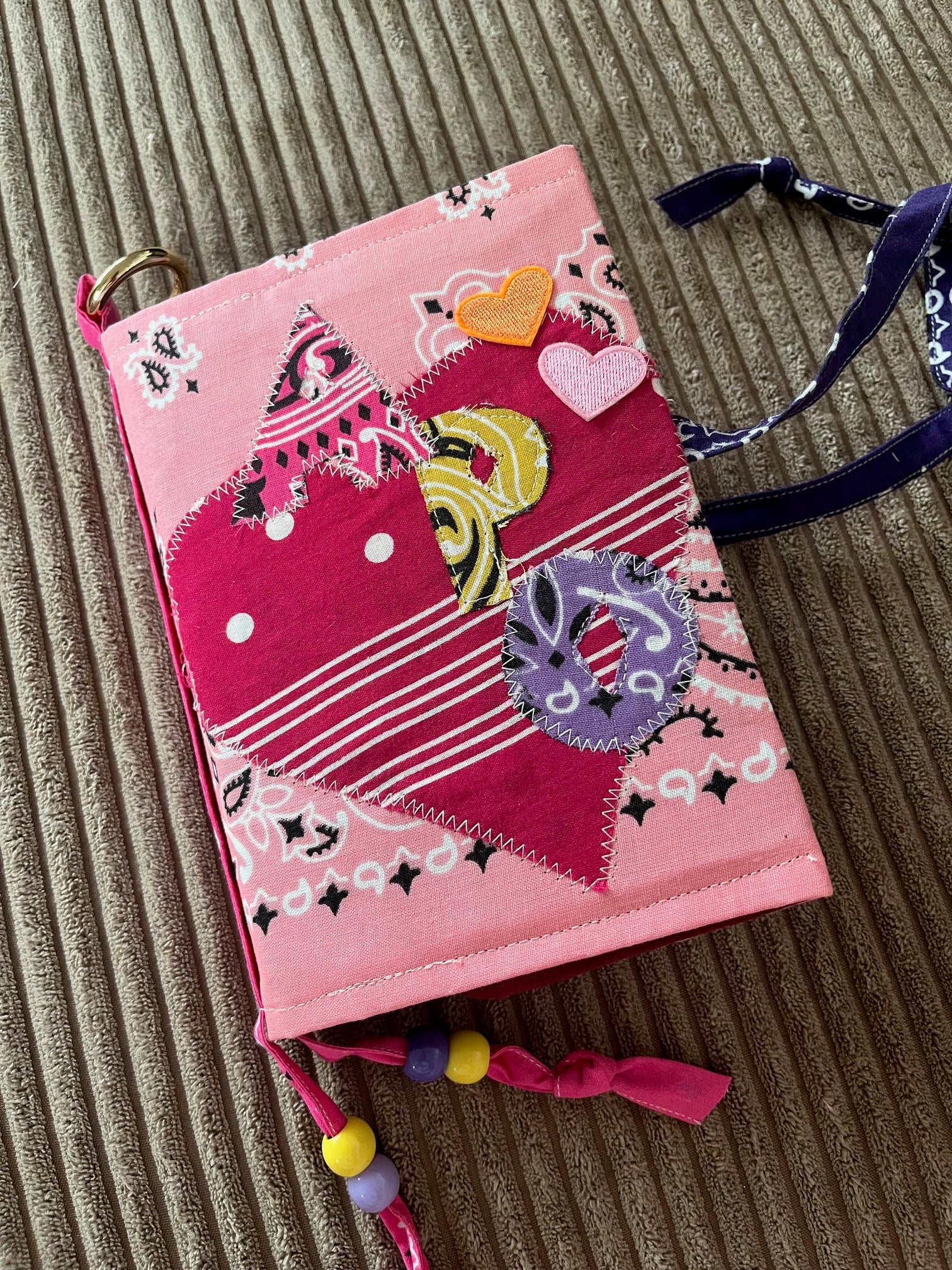 4) ajout d'un coeur en bandana sur la couverture et de perles ou initiales sur la lanière