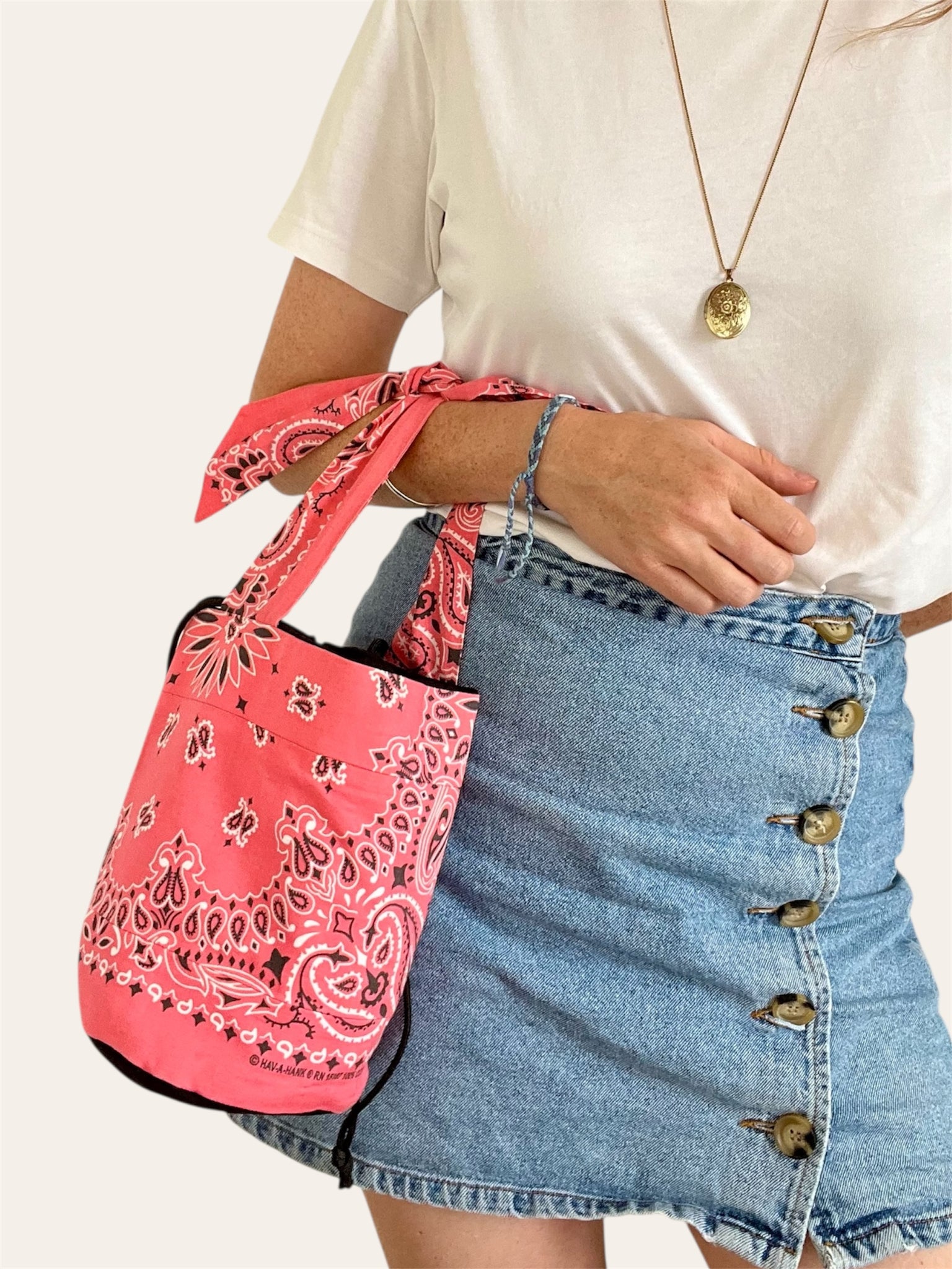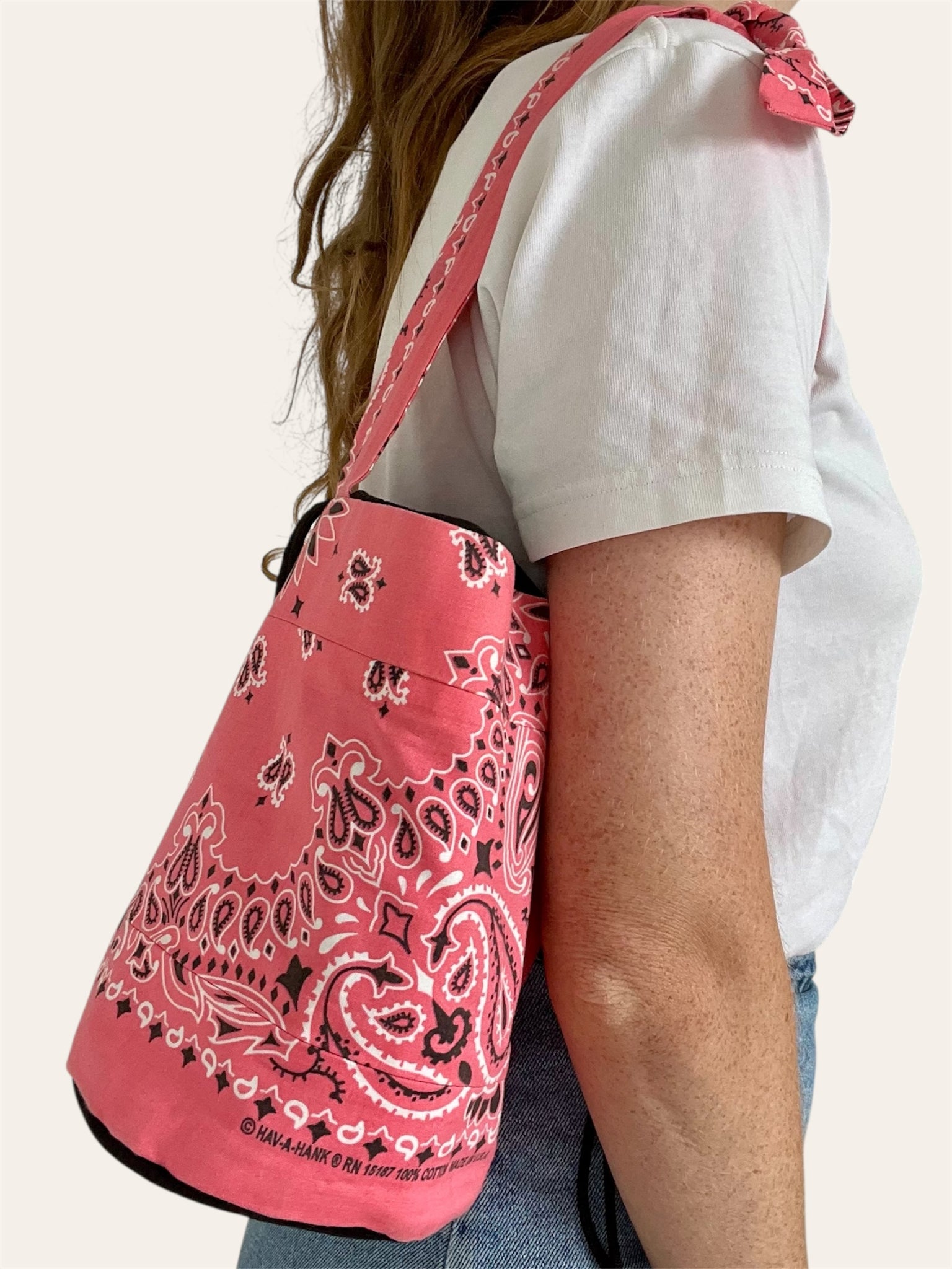 Bandanas (100% coton made in USA, fabriqué de façon traditionnelle à Greenville en Caroline du Sud, depuis 1947) / Doublure en coton noir et petite poche intérieure / Anses 46cm | Hauteur 22 cm | Diamètre environ 15 cm